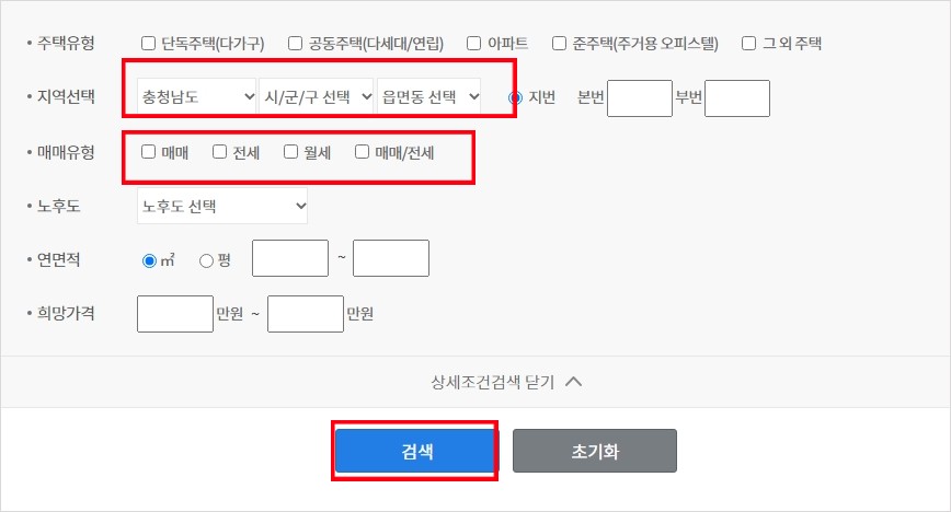 주택 유형과 지역,매매 유형 등을 선택해 '검색'을 클릭합니다.