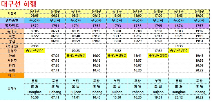 동대구역에서 하양역,영천역,북영천역,신경주역,아화역,서경주역,안강역,포항역까지 운행하는 무궁화호 열차시간표입니다.