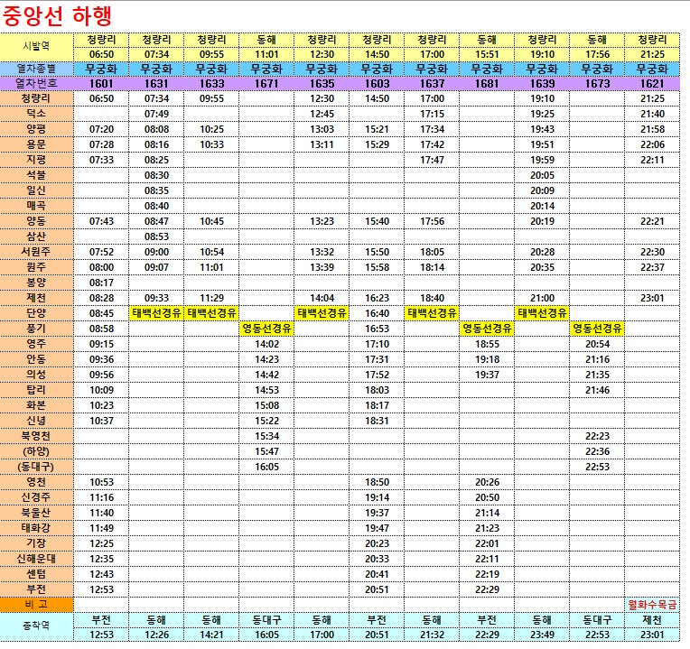 2023년 무궁화호 열차시간표 엑셀 첨부파일입니다.