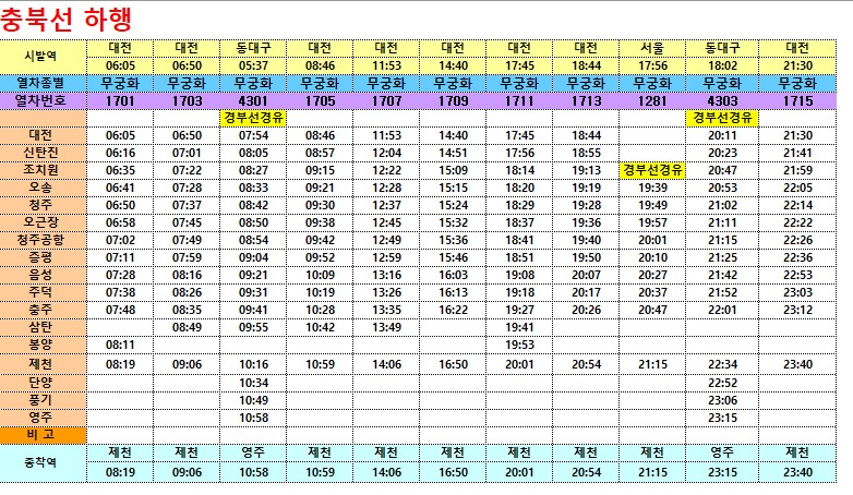 충북선 무궁화호 열차시간표입니다.