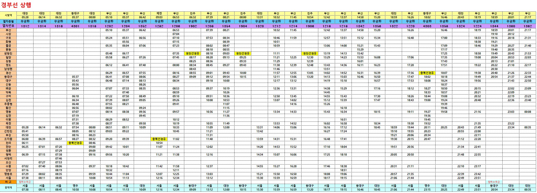 경부선 상행선과 새마을호 누리로 등은 아래 첨부파일을 다운받으시면 확인 가능합니다.