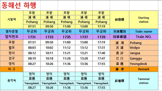 11. 무궁화호 동해남부선 하행 시간표