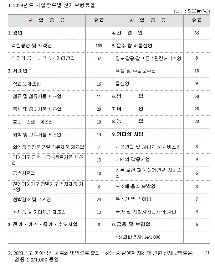 산재보험료 요율은 고용노동부에서 매년 고시 합니다. 2023년 산재보험료 요율도 확정 발표 되었습니다. 산재보험요율은 업종마다 차이가 있습니다. 2023년 산재보험요율 확정 정보에 대해 아래에서 자세히 확인 하실 수 있습니다.