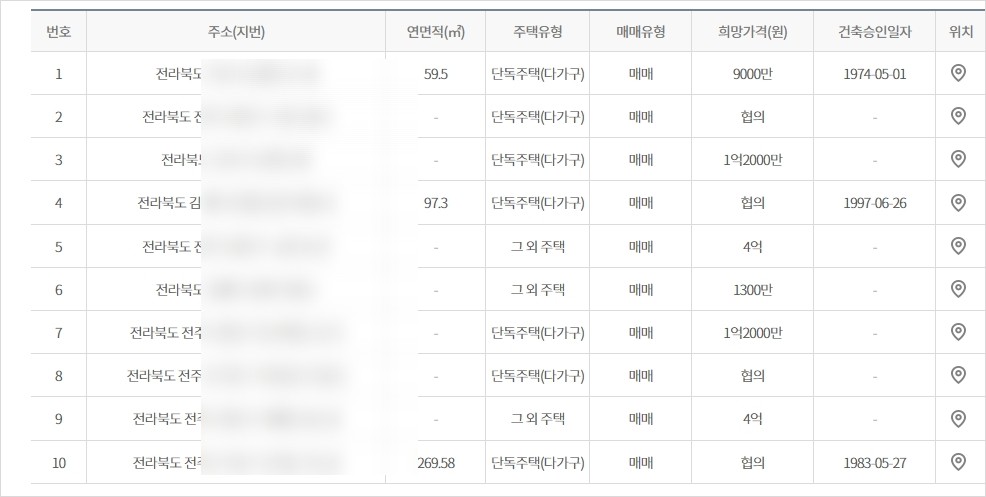 이렇게 각 주택 주소와 연면적,매매 유형,희망가격 과 지도 위치를 확인 할 수 있습니다.