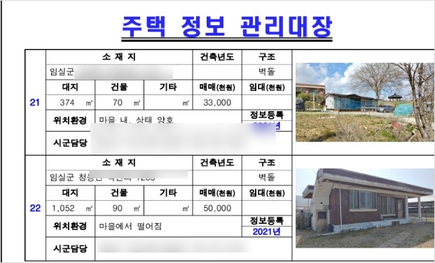 이렇게 빈집 주택과 농지 정보 관리대장에서 소재지와 위치환경, 매매가격, 사진정보를 볼 수 있습니다