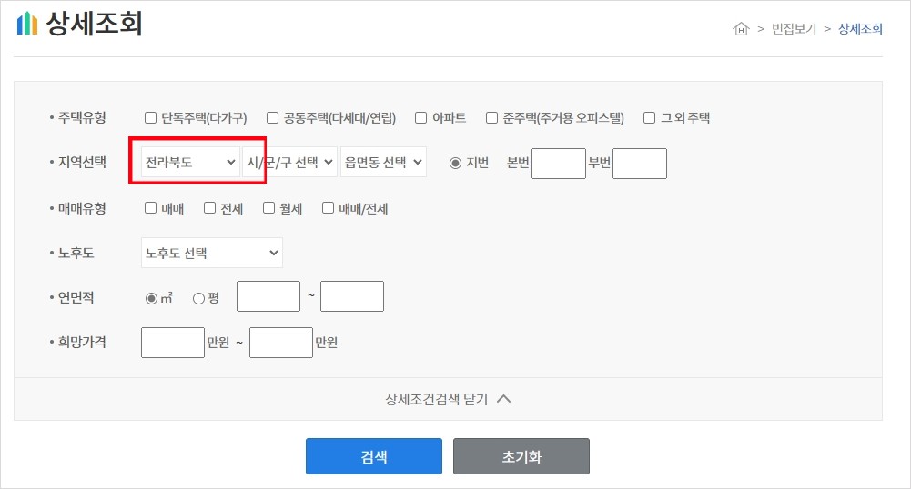 임실군의 운암면,신덕면,신평면,관촌면,성수면,지사면,오수면,삼계면,임실읍,청웅면,강진면,덕치면,운안면과 신청군의 구림면,북흥면,구림면,팔덕면,인계면,적성면,동계면,유동면,순창읍,풍산면,금과면과 고창군의 성내면,흥덕면,부안면,신림면,고창읍,고수면,성송면,대산면,무상면,아산면,심원면,해리면,상하면,공읍면, 부안군의 하서면,계화면,동진면,백산면,부안읍,주산면,보안면,줄포면,진서면,변산면,상서면 등의 전라북도 지역 빈집 정보 조회 가 가능합니다.