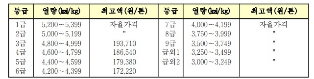 | 등급 | 열량(kcal/kg) | 최고가격(원/톤) | 등급 | 열량(kcal/kg) | 최고가격(원/톤) |