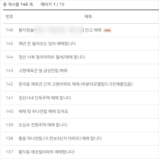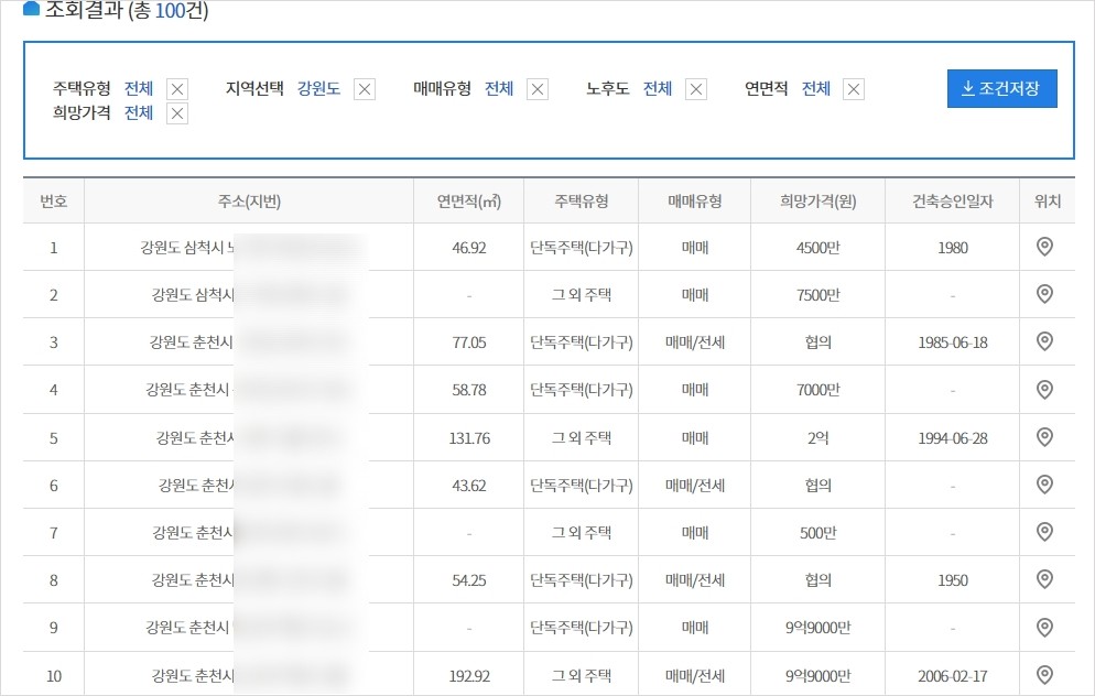 이렇게 검색을 하면 주소와 연면적,주택유형,희망가격등이 있어서 싸고 저렴한 곳이나 시세를 확인 할 수 있습니다.
