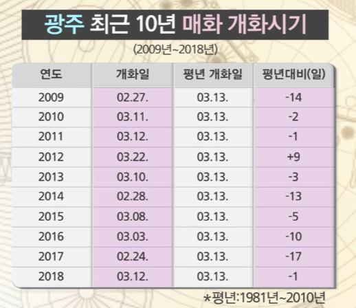 이런 예측으로 매화 개화시기는 작년 및 평년과 비슷할 것으로 보입니다.